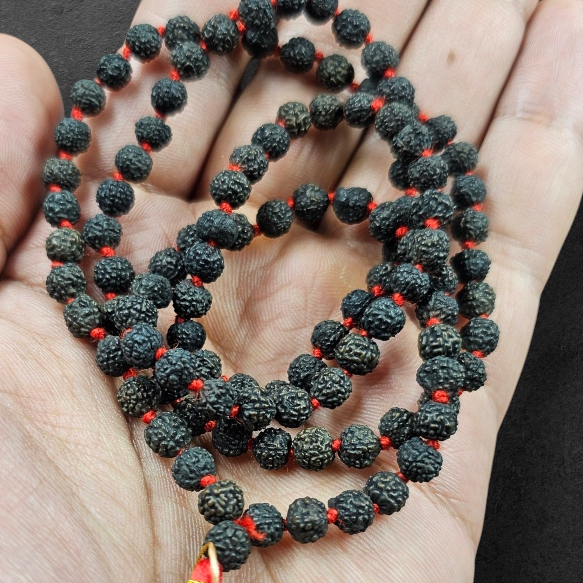 A Rudraksha mala is a traditional prayer bead necklace made from Rudraksha seeds, which are considered sacred in Hinduism and some other spiritual practices. The name "Rudraksha" comes from two words: "Rudra" (a name for Lord Shiva) and "Aksha" (meaning eye), which is believed to represent the tears of Lord Shiva. The beads are commonly used for meditation, prayer, or spiritual practices.