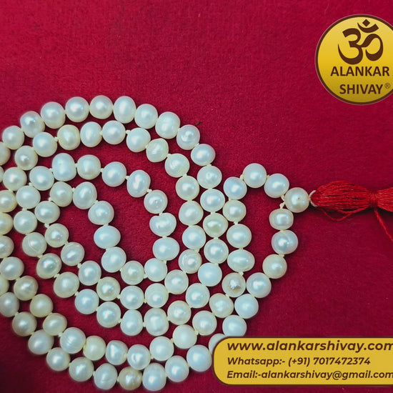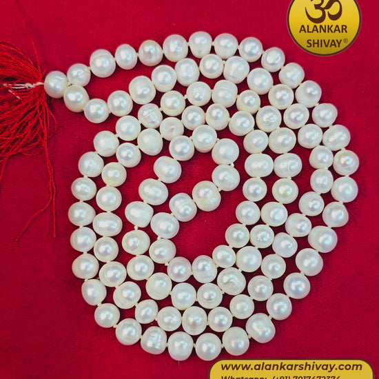 A Pearl Mala is a sacred mala made from pearls, which are traditionally considered a symbol of purity, beauty, and wisdom. Pearls are highly revered in various cultures and spiritual traditions, especially in Hinduism and Buddhism, where they are used for meditation, prayer, and mantra chanting. The Pearl Mala typically consists of 108 beads, with a Sumeru or larger bead at the end.